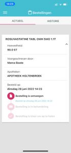 De aanvraag is bij de apotheek en uw geneesmiddelen worden klaargemaakt en\of besteld. Dit is de status per geneesmiddel en niet voor alle aangevraagde geneesmiddelen. |
